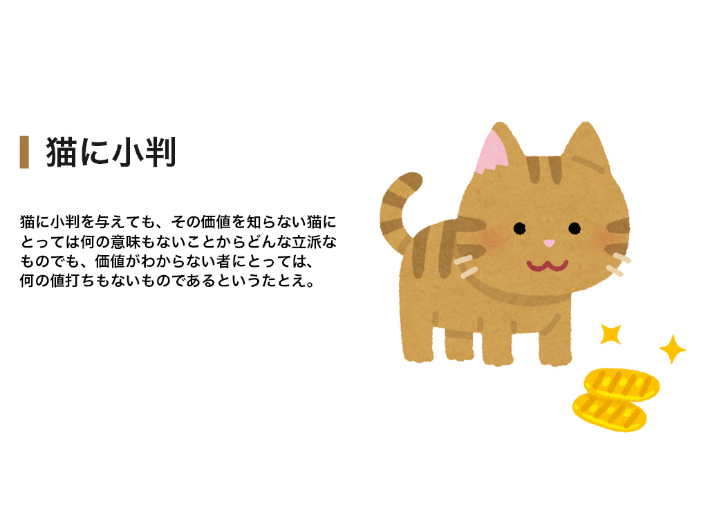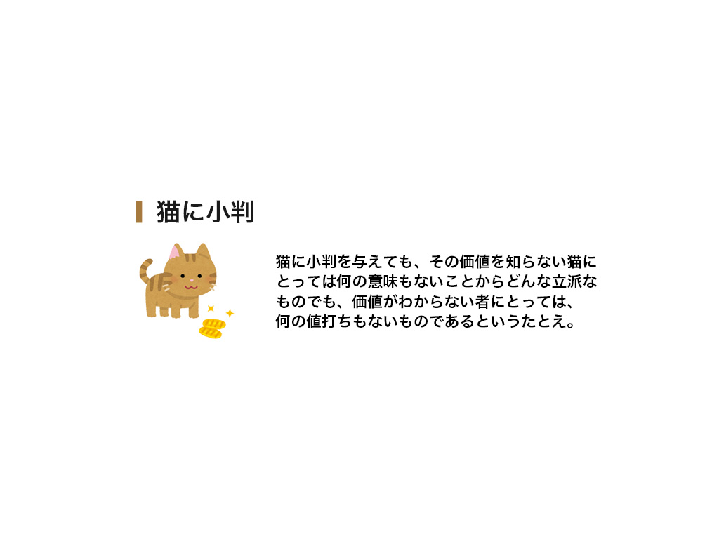 <div class="item3"><p>猫に小判を与えても、その価値を知らない猫に
