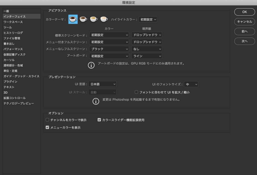 photoshopを起動してメニューの「photoshop cc」→「環境設定」→「インターフェース」