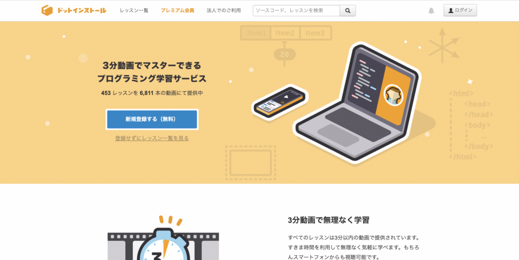 こちらもレッスンごとに分かれており、HTMLの基礎的な部分は無料で学ぶことができます。